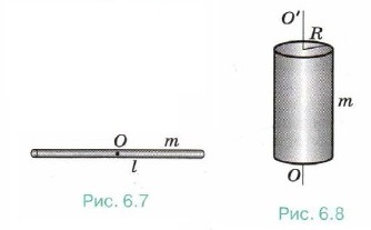 Приведём значения моментов инерции для некоторых абсолютно твёрдых однородных тел массой m. 1. Момент инерции тонкого прямого стержня длиной l относительно оси, перпендикулярной к стержню и проходящей через его середину (рис. 6.7), равен: I = ml2/12.