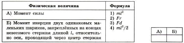 Вопросы к параграфу 1. Что такое момент силы? момент инерции тела? 2. Какое тело сложнее заставить вращаться — диск или колесо? Массы и радиусы диска и колеса одинаковы. Образцы заданий ЕГЭ А 1. Момент инерции диска массой 1 кг и диаметром 40 см равен 1) 0,16 кг • м2 2) 0,04 кг • м2 3) 0,02 кг • м2 4) 0 А 2.Радиус диска равен 10 см. Момент силы, равной 10 Н и приложенной к ободу диска под углом 150° к радиусу, равен 1) 0,5 Н • м 2) 0,87 Н • м 3) 1 Н • м 4) 0 B 3. Установите соответствие между физическими величинами и формулами, определяющими их. К каждой позиции первого столбца подберите нужную позицию второго и запишите в таблицу выбранные цифры под соответствующими буквами.