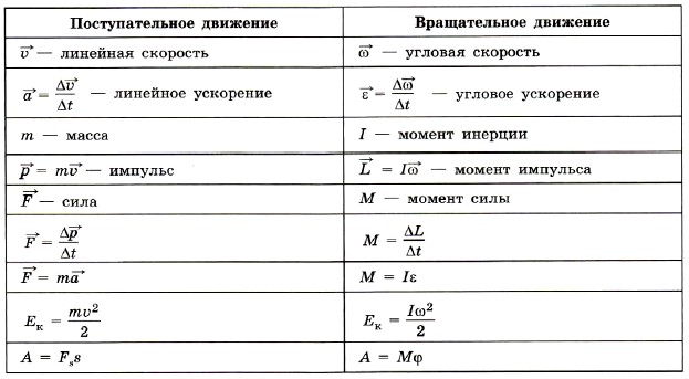 В таблице сопоставлены формулы механики поступательного движения материальной точки с аналогичными формулами вращательного движения твёрдого тела.