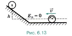 Глава 6. Динамика вращательного движения абсолютно твёрдого тела Примеры решения задач по теме «Динамика вращательного движения абсолютно твёрдого тела»Р е ш е н и е. Так как внешние силы — сила тяжести и сила реакции опоры, направленные параллельно оси вращения, не могут изменить момент импульса системы тел «скамья—человек», то согласно закону сохранения импульса I1ω1 = I2ω2. (1) Когда человек находится в центре скамьи, то момент инерции системы равен только моменту инерции скамьи: I1 = Iск. После того как человек перешёл на край скамьи, момент инерции системы стал равен I2 = Iск + mr2. Угловая скорость связана с числом оборотов в секунду соотношением ω1 = 2πn. Подставив найденные выражения в уравнение (1), получим Iск2πn = (Iск + mr2)ω2. Тогда Изменение угловой скорости Задача 3. На наклонную плоскость вкатывается колесо, двигавшееся по горизонтальной поверхности со скоростью 4 м/с. Вся масса колеса сосредоточена в ободе. Определите максимальную высоту, на которую поднимется колесо. Работой силы трения можно пренебречь. Р е ш е н и е. Выберем нулевой уровень отсчёта потенциальной энергии так, как показано на рисунке 6.13. Учтём, что момент инерции колеса-обруча I = mR2, а угловая скорость вращения ω = υ/R. Механическая энергия колеса на горизонтальной поверхности равна сумме кинетических энергий поступательного и вращательного движений колеса:
