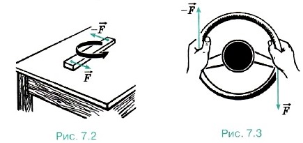 Если сумма внешних сил равна нулю, то равна нулю и сумма проекций этих сил на оси координат. В частности, для проекций внешних сил на ось ОХ можно записать: F1x + F2x + F3x + ... = 0. (7.3) Такие же уравнения можно записать и для проекций сил на оси OY и OZ. Второе условие равновесия твёрдого телаУбедимся, что условие (7.2) является необходимым, но недостаточным для равновесия твёрдого тела. Приложим к доске, лежащей на столе, в различных точках две равные по модулю и противоположно направленные силы так, как показано на рисунке 7.2. Сумма этих сил равна нулю:
