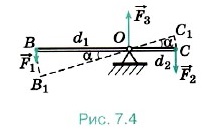 Пусть к рычагу приложены перпендикулярно стержню силы Кроме сил Вычислим работу, которую совершают внешние силы при повороте рычага на очень малый угол α. Точки приложения сил Пройденные пути s1 и s2 можно выразить через угол поворота рычага а, измеренный в радианах: s1 = α|ВО| и s2 = α|СО|. Учитывая это, перепишем выражения для работы так: А1 = F1α|BO|, (7.4)