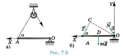 Выберем оси координат так, как показано на рисунке (7.6, б). Поскольку дверь находится в равновесии, то сумма моментов всех сил относительно, например, шарнира равна нулю: М1 + М + М2 = 0. Здесь M1, М, М2 — моменты сил Значит, М1 = -Tlsinα, Теперь запишем правило моментов сил, учитывая знаки этих моментов: Отсюда находим силу натяжения верёвки: