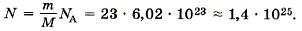 Глава 8. Основы молекулярно-кинетической теории § 54. Примеры решения задач по теме «Основные положения МКТ»При решении большей части задач нужно уметь определять молярные массы веществ. Для этого по известным из таблицы Менделеева относительным атомным массам надо определить относительную молекулярную массу, а затем и молярную массу по формуле М = 10-3 Мr кг/моль, где М — молярная масса, Мr — относительная молекулярная масса. Во многих задачах требуется по известной массе m тела определить количество вещества ν или число молекул (атомов) N в нём. Для этого используют формулы Задача 1. Определите молярную массу воды и затем массу одной молекулы воды. Р е ш е н и е. Относительная атомная масса водорода равна 1,00797, а кислорода равно 15,9994. Химическая формула воды — Н2O. Следовательно, относительная молекулярная масса воды равна: Мr = 2 • 1,00797 + 15,9994 = 18,01534 ≈ 18. Молярная масса воды М ≈ 10-3 • 18 кг/моль = 0,018 кг/моль. В любом веществе, взятом в количестве 1 моль, содержится NA молекул, где NA — число Авогадро; NA = 6,02 • 1023. Тогда масса одной молекулы воды
