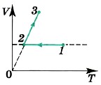 A 2. В координатах V, Т представлена зависимость объёма идеального газа постоянной массы от абсолютной температуры. Как изменяется давление в процессе 1—2—3? 1) на участках 1—2 и 2—3 увеличивается 2) на участках 1—2 и 2—3 уменьшается 3) на участке 1—2 уменьшается, на участке 2—3 остаётся неизменным 4) на участке 1—2 не изменяется, на участке 2—3 увеличивается
