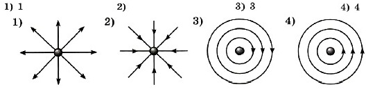 Вопросы к параграфу 1. Что называется напряжённостью электрического поля? 2. Что называют силовыми линиями электрического поля? 3. Могут ли силовые линии пересекаться? Образцы заданий ЕГЭ A 1. Направление вектора напряжённости электрического поля совпадает с направлением силы, действующей на 1) незаряженный металлический шар, помещённый в электрическое поле 2) отрицательный пробный заряд, помещённый в электрическое поле 3) положительный пробный заряд, помещённый в электрическое поле 4) ответа нет, так как напряжённость поля — скалярная величина A 2. Сила, действующая в поле на заряд 0,00002 Кл, равна 4 Н. Напряжённость поля в этой точке равна 1) 200 000 Н/Кл 2) 0,00008 В/м 3) 0,0008 Н/Кл 4) 5 • 10-6 Кл/Н A 3. Силовая линия электрического поля — это 1) линия, вдоль которой в поле будет двигаться положительный заряд 2) линия, вдоль которой в поле будет двигаться отрицательный заряд 3) светящаяся линия в воздухе, которая видна при большой напряжённости поля 4) линия, в каждой точке которой напряжённость поля направлена по касательной A 4. На каком рисунке правильно изображена картина линий напряжённости электростатического поля точечного положительного заряда?