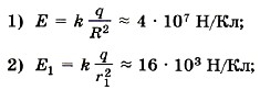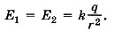 Глава 14. Электростатика § 91. Примеры решения задач по теме «Напряжённость электрического поля. Принцип суперпозиции полей»При решении задач с использованием понятия напряжённости электрического поля нужно прежде всего знать формулы (14.8) и (14.9), определяющие силу, действующую на заряд со стороны электрического поля, и напряжённость поля точечного заряда. Если поле создаётся несколькими зарядами, то для расчёта напряжённости в данной точке надо сделать рисунок и затем определить напряжённость как геометрическую сумму напряжённостей полей. Задача 1. Два одинаковых положительных точечных заряда расположены на расстоянии r друг от друга в вакууме. Определите напряжённость электрического поля в точке, расположенной на одинаковом расстоянии r от этих зарядов. Р е ш е н и е. Согласно принципу суперпозиции полей искомая напряжённость
