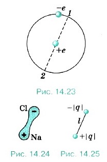 Электрон движется в атоме с большой скоростью. Один оборот вокруг ядра он делает за очень малое время, порядка 10-15 с. Поэтому, например, уже за 10 9 с он успевает совершить миллион оборотов и, следовательно, миллион раз побывать в двух любых точках 1 и 2, расположенных симметрично относительно ядра. Это даёт основание считать, что в среднем по времени центр распределения отрицательного заряда приходится на середину атома, т. е. совпадает с положительно заряженным ядром. Однако так обстоит дело не всегда. Рассмотрим молекулу поваренной соли NaCl. Атом натрия имеет во внешней оболочке один валентный электрон, слабо связанный с атомом. У атома хлора семь валентных электронов. При образовании молекулы единственный валентный электрон натрия захватывается хлором. Оба нейтральных атома превращаются в систему из двух ионов с зарядами противоположных знаков (рис. 14.24). Положительный и отрицательный заряды не распределены теперь симметрично по объёму молекулы: центр распределения положительного заряда приходится на ион натрия, а отрицательного — на ион хлора. Электрический дипольНа большом расстоянии такую молекулу можно приближённо рассматривать как электрический диполь (рис. 14.25).