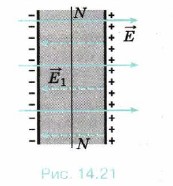 В первый момент (при внесении пластины в поле) возникает электрический ток. Под действием электрического поля электроны пластины начинают перемещаться справа налево. Левая сторона пластины заряжается отрицательно, а правая — положительно (см. рис. 14.21). В этом состоит явление электростатической индукции. (Если, не убирая пластину из поля, разделить её пополам вдоль линии NN (см. рис. 14.21), то обе половины окажутся заряженными.)