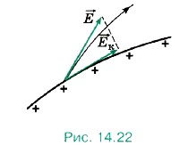 Докажем это. Предположим, что какая-то силовая линия не перпендикулярна поверхности проводника (рис. 14.22). Это означает, что касательная составляющая вектора напряжённости электрического поля не равна нулю. Следовательно, на свободные заряды действует сила, перемещающая их по поверхности проводника. Это перемещение будет происходить до тех пор, пока все силовые линии не станут перпендикулярными поверхности проводника.