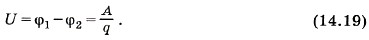 Так как потенциальная энергия Wn = дчр, то работа сил поля равна: А = - (Wп2 - Wп1) = -q(φ2 - φ1) = q(φ1 - φ2) = qU. (14.17) Здесь U = φ1 - φ2 — (14.18) разность потенциалов, т. е. разность значений потенциала в начальной и конечной точках траектории.
