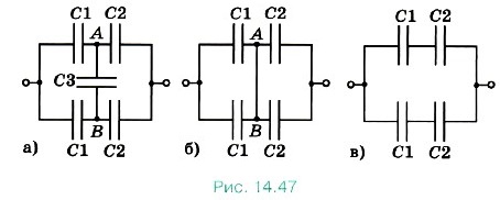 Можно также просто не учитывать присутствие в схеме конденсатора СЗ, так как заряд на нём равен нулю. Тогда схема преобразуется к виду, изображённому на рисунке (14.47, в). Конденсаторы С1 и С2 соединены последовательно, следовательно,