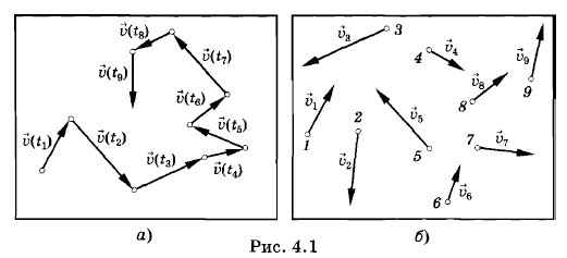 Глава 4. Молекулярно-кинетическая теория идеального газа Системы с большим числом частиц и законы механики. Статистическая механикСтатистическая механикаТрудности создания количественной теории процессов, происходящих внутри макроскопических тел, на основе представления о движении молекул кажутся на первый взгляд непреодолимыми. Однако задача исследования систем из огромного числа частиц все же поддается решению. Поведение таких систем обнаруживает определенные закономерности. Но это уже закономерности нового типа, закономерности статистической механики, или статистической физики. Оказывается, что для описания свойств макроскопических тел и процессов с их участием, которые наблюдаются на опыте, не нужно знать микроскопическое состояние системы (значения всех координат и импульсов частиц). Важно знать не поведение отдельных молекул, а средний результат, к которому приводит их совокупное движение. Этот средний результат и можно предвидеть с помощью законов статистической механики. Очевидно, каждому микроскопическому состоянию отвечает определенное макроскопическое состояние (определенные значения макроскопических параметров). Однако одному и тому же макроскопическому состоянию может отвечать огромное число микроскопических состояний. Например, ни давление, ни температура газа в состоянии термодинамического равновесия не меняются, но молекулы, из которых состоит газ, непрерывно движутся, микроскопические состояния системы непрерывно сменяют друг друга. Средние по времени и статистические средниеПеред статистической механикой стоит задача определения средних значений любых функций координат и скоростей молекул без вычисления зависимости этих величин от времени. Посмотрим, как в принципе можно решить эту задачу на примере вычисления среднего значения квадрата скорости Υ2 молекулы газа, от которого зависит ее средняя кинетическая энергия Допустим, что в сосуде с газом, температура которого поддерживается постоянной, имеется достаточно большое число N молекул. Выделим мысленно одну из них. Если произвести ряд последовательных измерений скорости данной молекулы в моменты времени t1, t2, t3 и т. д. через малые одинаковые промежутки времени (рис. 4.1, а), проделав достаточно большое число N1 измерений (в принципе это возможно), то среднее по времени значение квадрата скорости можно записать так: