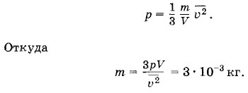 Глава 4. Молекулярно-кинетическая теория идеального газа Примеры решения задач на тему: Молекулярно-кинетическая теория идеального газаПри решении задач на применение молекулярно-кинетической теории идеального газа используются основное уравнение кинетической теории газов в форме (4.4.9) или (4.4.10) и вытекающие из него выражения для средней кинетической энергии молекул (4.5.5) и средней квадратичной скорости (4.7.2) или (4.7.3). Значительное количество задач удобно решать, используя формулу (4.5.6), связывающую давление газа с концентрацией молекул и абсолютной температурой. Внутренняя энергия идеальных одноатомных газов (например, инертных газов) вычисляется по формуле (4.8.1). Задача 1Чему равна масса газа, содержащегося в закрытом цилиндре вместимостью V = 0,5 л, если давление газа р = 5 • 105 Па, а средняя квадратичная скорость молекул Решение. Согласно основному уравнению молекулярнокинетической теории