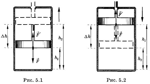 Модуль силы, действующей со стороны газа на поршень, равен F' = pS, где р — давление газа, a S — площадь поверхности поршня. Пусть газ расширяется и поршень смещается в направлении силы на малое расстояние Δh = h2 - h1 Если перемещение мало́, то давление газа можно считать постоянным. Работа газа равна А' = F' Δh = pS(h2 - h1) = p(Sh2 - Sh1). (5.1.1) Эту работу можно выразить через изменение объема газа. Начальный объем V1 = Shlt а конечный V2 = Sh2. Поэтому A' = p(V2 - V1) = pΔV, где ΔV = V2 - V1 — изменение объема газа. При расширении газ совершает положительную работу, так как направления силы и перемещения поршня совпадают. Если газ сжимается, то формула (5.1.2) для работы газа остается справедливой. Но теперь V2 < V1, и поэтому А' < 0 (рис. 5.2). Работа А, совершаемая внешними телами над газом, отличается от работы газа А' только знаком: А = -А', так как сила A = -A' = -pΔV. (5.1.3) Знак минус указывает, что при сжатии газа, когда ΔV = V2 — V1 < 0, работа внешней силы положительна. Понятно, почему в этом случае А > 0: при сжатии газа направления силы и перемещения совпадают. При расширении газа, наоборот, работа внешних тел отрицательна (А < 0), так как ΔV = V2 - V1 > 0. Теперь направления силы и перемещения противоположны . Выражения (5.1.2) и (5.1.3) справедливы не только при сжатии или расширении газа в цилиндре, но и при малом изменении объема любой системы. Если процесс изобарный (р = const), то эти формулы можно применять и для больших изменений объема. Геометрическое истолкование работыРаботе газа А' для случая постоянного давления можно дать простое геометрическое истолкование. Построим график зависимости давления газа от объема (рис. 5.3). Здесь площадь прямоугольника abcd, ограниченная графиком p1 = const, осью V и отрезками аb и cd, равными давлению газа, численно равна работе (5.1.2).