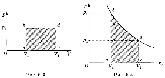 В общем случае при произвольном изменении объема газа давление не остается неизменным. Например, при изотермическом процессе оно убывает обратно пропорционально объему (рис. 5.4). В этом случае для вычисления работы нужно общее изменение объема разделить на малые части, вычислить элементарные (малые) работы, а потом все их сложить. Работа газа по-прежнему будет численно равна площади фигуры, ограниченной графиком зависимости р от V, осью V и отрезками ab и cd, равными давлениям р1 и р2 в начальном и конечном состояниях.