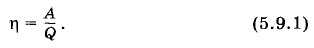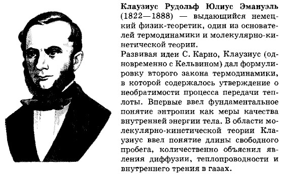Есть несколько формулировок второго закона термодинамики, которые, несмотря на внешнее различие, выражают в сущности одно и то же и поэтому равноценны. Немецкий ученый Р. Клаузиус сформулировал этот закон так: невозможно перевести тепло от более холодной системы к более горячей при отсутствии одновременных изменений в обеих системах или окружающих телах. Здесь констатируется опытный факт определенной направленности теплопередачи: теплота сама собой переходит всегда от горячих тел к холодным. Правда, в холодильных установках осуществляется теплопередача от холодного тела к более теплому, но эта передача связана с другими изменениями: охлаждение достигается за счет работы. Другая формулировка принадлежит английскому ученому У. Кельвину: невозможно осуществить такой периодический процесс, единственным результатом которого было бы получение работы за счет теплоты, взятой от одного источника. Здесь опять констатируются и уточняются опытные факты. Если, например, паровая машина совершает работу за счет теплоты, полученной от парового котла, то при этом совершаемая работа не является единственным результатом процесса, так как часть теплоты обязательно уходит в атмосферу вместе с отработанным паром. То же самое относится к двигателям внутреннего сгорания и вообще ко всем тепловым двигателям. Иначе говоря, ни один тепловой двигатель не может иметь коэффициент полезного действия, равный единице. Под коэффициентом полезного действия η теплового двигателя понимают отношение совершенной машиной работы А к количеству полученной для этой цели теплоты Q: