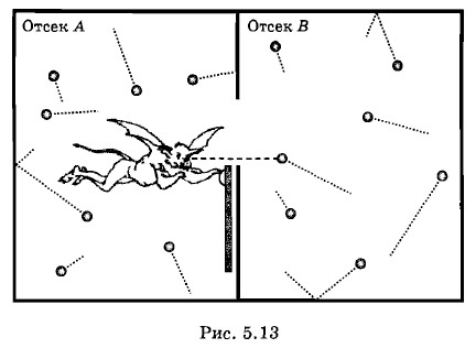 так как данному макросостоянию соответствует одно микросостояние (см. рис. 5.12, а, б). Вероятность же того, что молекулы распределятся поровну, будет в 6 раз больше: