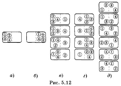 Пусть у нас имеется «газ» в сосуде, состоящий всего лишь из четырех молекул. Вначале все молекулы находятся в левой половине сосуда, отделенной перегородкой от правой половины (рис. 5.12, а). Уберем перегородку, и «газ» начнет расширяться, занимая весь сосуд. Посмотрим, какова вероятность того, что «газ» опять сожмется, т. е. молекулы снова соберутся в одной половине сосуда. В нашем примере макросостояние будет характеризоваться указанием числа молекул в одной половине сосуда безотносительно к тому, какие именно молекулы здесь находятся. Микросостояния задаются распределением молекул по половинам сосуда с указанием того, какие именно молекулы занимают данную половину сосуда. Пронумеруем молекулы цифрами 1, 2, 3, 4. Возможны 16 различных микросостояний, все они изображены на рисунке 5.12, а — д. Вероятность того, что все молекулы соберутся в одной половине (например, левой) сосуда, равна