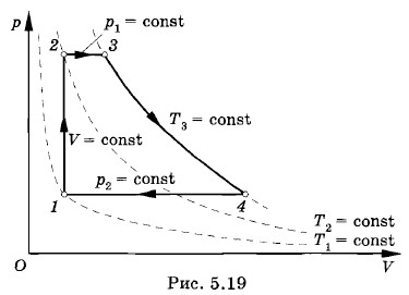 Глава 5. Законы термодинамики § 5.13. Примеры решения задач на тему: Законы термодинамикиЗадача 6В цилиндре под поршнем находится газ, состояние которого меняется следующим образом: при переходе из состояния 1 в состояние 2 давление увеличивается при постоянном объеме V; при переходе 2—3 увеличивается объем при постоянном давлении р1; переход 3—4 происходит с увеличением объема при постоянной температуре; при переходе 4—1 газ возвращается к первоначальному состоянию при постоянном давлении р2. Изобразите в координатах р, V; р, Т и V, Т графики изменения состояния газа и определите, при каких процессах газ получает теплоту, при каких отдает; как при этом меняется температура и какая работа совершается газом. Решение. График изменения состояния в координатах р, V приведен на рисунке 5.19. Процесс 1—2 — нагревание при постоянном объеме, температура увеличивается (Т2 > T1), следовательно, к газу подводится некоторое количество теплоты (Q > 0); работы газ не совершает (V = const, А'1 = 0).