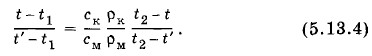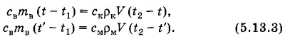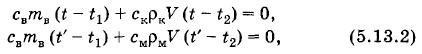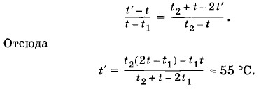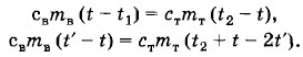 Задача 3После опускания в воду, имеющую температуру t1 = 10 °С, тела, нагретого до температуры t2 = 100 °С, через некоторое время установилась общая температура t = 40 °С. Какой станет температура воды t', если, не вынимая первого тела, в нее опустить еще одно такое же тело, нагретое тоже до температуры t2 = 100 °С? Решение. Пренебрегая нагреванием сосуда и тепловыми потерями, запишем уравнение теплового баланса после опускания первого тела:свтв (t - t1) + cTmT (t - t2) = 0, (5.13.6) Преобразуем уравнения (5.13.6) и (5.13.7) так:
