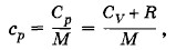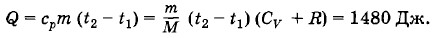 Задача 4В цилиндре под тяжелым поршнем, перемещающимся без трения, находится углекислый газ массой m = 20 г. Газ нагревается от температуры t1 = 20 °С до температуры t2 = 108 °С. Какое количество теплоты было при этом сообщено газу? Молярная теплоемкость углекислого газа (теплоемкость 1 моль) при постоянном объеме CV = 28,8 Дж/(К • моль). Решение. Молярная теплоемкость при постоянном давлении согласно формуле (5.6.7) равнаСр = CV + R. Удельная теплоемкость