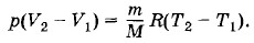 Задача1Вычислите работу идеального газа массой m при его изобарном нагревании на ΔТ. Решение. Обозначим постоянное давление газа через р, начальный и конечный объемы газа — соответственно через V1 и V2, а начальную и конечную температуры — через Т1 и Т2. Согласно уравнению Менделеева—Клапейрона имеем