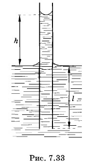 16. В капиллярной трубке, опущенной вертикально в воду на глубину l, вода поднялась на высоту h (рис. 7.33). Нижний конец трубки закрывают, вынимают ее из воды и снова открывают. Определите длину столбика воды, оставшейся в трубке. 17. Стеклянная капиллярная трубка, внутренний диаметр которой d = 0,5 мм, погружена в воду. Верхний конец трубки выступает на h = 2 см над поверхностью воды. Какую форму имеет мениск? Чему равен его радиус кривизны? 18. Капиллярная стеклянная трубка имеет радиус канала r = 0,05 см и запаяна сверху. Трубка открытым концом опускается вертикально в воду. Какой длины следовало бы взять трубку, чтобы при этих условиях вода в ней поднялась на высоту h = 1 см? Давление воздуха р0 = 105 Па. Поверхностное натяжение воды σ = 7 • 10-2 Н/м. 19. Каким образом можно без потерь налить жидкость в сосуд, находясь в условиях невесомости (на космическом корабле)? Как в этих условиях извлечь жидкость из сосуда? 20. Великому датскому физику Н. Бору довелось однажды мыть посуду в горной альпийской хижине. Он был крайне удивлен, увидев, что можно получить чистую посуду с помощью небольшого количества грязной воды и грязной тряпки. В чем здесь дело?
