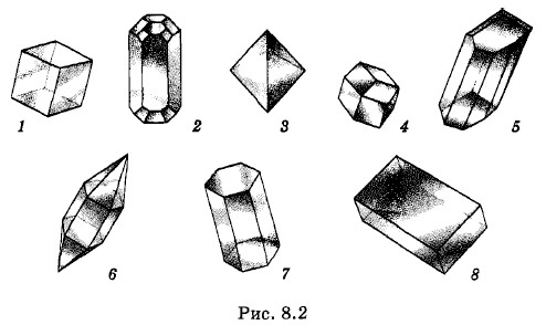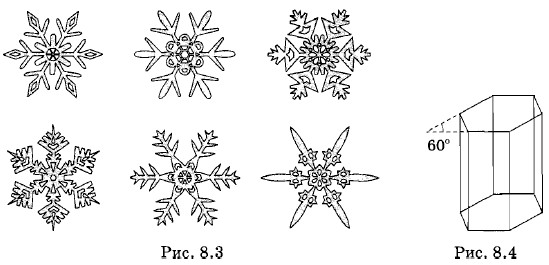 На рисунке 8.1 изображен крупный монокристалл кварца (горного хрусталя). Маленькая крупинка сахарного песка тоже является монокристаллом. Соблюдая большие предосторожности, можно вырастить металлический монокристалл больших размеров. Большинство кристаллических тел состоит из множества беспорядочно расположенных и сросшихся между собой мелких кристалликов. Такие тела называются поликристаллическими. Поликристаллическими являются все металлы и минералы. Кусок сахара тоже поликристаллическое тело. Форма и размеры кристалловКристаллы различных веществ имеют разнообразную форму. На рисунке 8.2 изображены кристаллы: каменной соли 1, берилла 2, алмаза 3, граната 4, кварца 5, турмалина 6, изумруда 7 и кальцита 3. Один из видов кристаллов льда, образующих причудливые формы снежинок (рис. 8.3), представляет собой правильную шестиугольную призму (рис. 8.4).