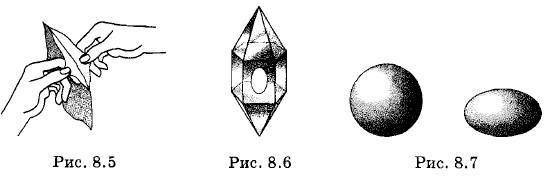 Размеры кристаллов тоже разнообразны. Одни кристаллы крупны и легко различимы невооруженным глазом, другие же настолько малы, что могут быть рассмотрены только в микроскоп. Размеры кристаллов поликристаллического типа могут с течением времени изменяться. Так, мелкие кристаллы железа и стали переходят в крупные. Этот переход ускоряется при ударах и сотрясениях. Он постоянно происходит в железнодорожных рельсах, вагонных осях, стальных мостах, отчего прочность этих сооружений с течением времени уменьшается. ПолиморфизмОчень многие тела одинакового химического состава в кристаллическом состоянии в зависимости от условий могут существовать в двух или более разновидностях (модификациях). Это свойство называется полиморфизмом (многоформностью). У льда, например, известно до десяти различных модификаций, которые получают в лабораториях. В природе же встречается только один вид (см. рис. 8.4). Особо важное значение для техники имеет полиморфизм углерода — углерод кристаллизуется в двух модификациях: графит и алмаз. Графит — мягкий материал матово-черного цвета. Из него, например, изготавливают грифели карандашей. Алмаз совершенно не похож на графит. Это прозрачный и очень твердый кристалл. При температуре около 150 °С (при нагревании в вакууме) алмаз превращается в графит. Чтобы графит превратить в алмаз, его нужно нагреть до 2000 °С под давлением 1010 Па. В настоящее время освоено промышленное производство искусственных алмазов. Искусственные алмазы широко используются в различных режущих инструментах. Анизотропия кристалловСущественным свойством монокристалла является анизотропия* — неодинаковость его свойств (механических, тепловых, электрических и т. д.) по различным направлениям. Например, если кристаллы поваренной соли, имеющие кубическую форму, раскалывать, то мелкие осколки будут иметь преимущественно форму прямоугольных параллелепипедов. Это значит, что в направлениях, параллельных граням, прочность кристалла поваренной соли гораздо меньше, чем в диагональных и других направлениях. * От греческих слов anisos — неравный, tropos — поворот, направление. Кусок слюды легко расслаивается в одном из направлений на тонкие пластинки (рис. 8.5). Расслоить его в направлении, перпендикулярном пластинкам, гораздо труднее. Также легко расслаивается в одном направлении кристалл графита. Если грань кристалла, например кварца, покрыть тонким слоем парафина и прикоснуться к нему раскаленной иглой, то парафин начнет плавиться. Расплавленный парафин имеет форму не круга, а эллипса (рис. 8.6), что указывает на различие теплопроводности кристалла по разным направлениям. О неодинаковости теплового расширения кристалла по разным направлениям можно заключить из следующего опыта. Если из монокристалла, например кварца, изготовить тело шарообразной формы и нагреть его, то после нагревания оно уже не будет шаром. Вдоль трех взаимно перпендикулярных диаметров тело расширится неодинаково, и вместо шара получится так называемый эллипсоид (рис. 8.7).