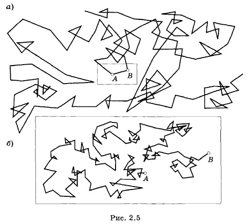 Глава 2. Основы молекулярно-кинетической теории § 2.3. Броуновское движение (окончание)На рисунке 2.5, а приведена схема движения броуновской частицы. Положения частицы определены через равные промежутки времени — 30 с и соединены прямыми линиями. В действительности траектория частицы гораздо сложнее. На рисунке 2.5, б в увеличенном масштабе представлена траектория частицы между точками А и В при условии, что ее положение регистрируется в 100 раз чаще, чем на рисунке 2.5, а. Отчетливо видно, что траектория остается подобной себе при произвольном увеличении. Подобные геометрические объекты были названы фракталами. Важность этого понятия для физики стала ясна совсем недавно (80-е годы).