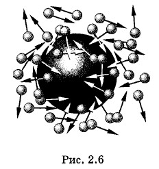 Объяснение броуновского движенияОбъяснить броуновское движение можно только на основе молекулярно-кинетической теории. Причина броуновского движения частицы состоит в том, что удары молекул жидкости о частицу не компенсируют друг друга. На рисунке 2.6 схематически показано положение одной броуновской частицы и ближайших к ней молекул.