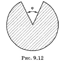 3. Из металлического диска вырезан сектор (рис. 9.12). Что произойдет с углом φ при нагревании диска? 4. Медный лист размером 60 х 50 см при 20 °С нагревается до 600 °С. Как изменится его площадь? Температурный коэффициент линейного расширения меди α1 = 1,7 • 10-5К-1. 5. Какое количество теплоты надо израсходовать, чтобы стальной рельс длиной 10 м и площадью поперечного сечения 20 см2 удлинился на 6 мм? Плотность стали ρ = 7,8 • 103 кг/м3. Температурный коэффициент линейного расширения 1,2 • 10-5К-1. Удельная теплоемкость стали с = 460 Дж/(кг • К). 6. Латунный сосуд при нагревании увеличился в объеме на n = 0,6% . На сколько градусов был нагрет сосуд, если температурный коэффициент линейного расширения латуни a = 2 • 10-5К-1? 7. Сообщающиеся сосуды заполнены жидкостью, имеющей температуру t1. При нагревании жидкости в одном из сосудов до температуры t2 уровень жидкости в этом сосуде установился на высоте h1; а в другом сосуде — на высоте h2. Найдите температурный коэффициент объемного расширения жидкости α. 8. Определите объем шарика ртутного термометра, если известно, что при температуре t0 = 0 °С ртуть заполняет шарик целиком, а объем канала между делениями, соответствующими 0 °С и 100 °С, равен V = 3 мм3. Температурный коэффициент объемного расширения ртути α = 1,8 • 10-4К-1, температурный коэффициент линейного расширения стекла α1 = 8 • 10-6К-1. 9. В кварцевый сосуд объемом V = 2,5 л помещен латунный цилиндр, масса которого m = 8,5 кг. Остальная часть сосуда заполнена водой. При нагревании сосуда вместе с содержимым на Δt = 3 К уровень воды в сосуде не изменился. Найдите температурный коэффициент объемного расширения воды. Температурный коэффициент линейного расширения кварца α1 = 4,2 • 10-7К-1, латуни α2 = 2 • 10-5К-1. Плотность латуни ρ = 8,5 • 103 кг/м3.