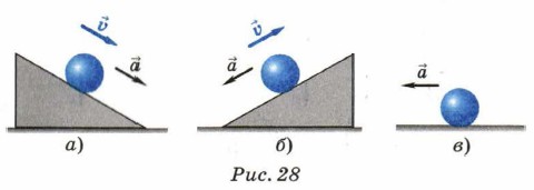 Анализируя результаты своих экспериментов, Галилей обосновал принцип инерции, прибегая для этого к следующим рассуждениям: опыты показывают, что, двигаясь по наклонной плоскости вниз, тело ускоряется (рис. 28, а), при движении вверх — замедляется (рис. 28, б). А если бесконечная плоскость не имеет наклона, то в таком случае нет причины, которая может заставить движущееся по ней тело ускориться или замедлиться (рис. 28, в). Таким образом,