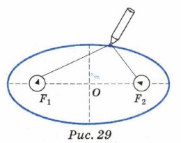 Прежде чем сформулировать законы Кеплера, необходимо познакомиться с такой фигурой, как эллипс. На плоской доске закрепим концы нити (например, с помощью канцелярских кнопок) и, натягивая нить карандашом, начертим на доске замкнутую кривую (рис. 29). Мы получим эллипс.