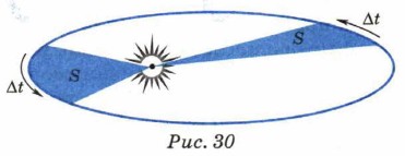 радиус, соединяющий центр Солнца с планетой, за равные промежутки времени описывает равные площади (рис. 30).