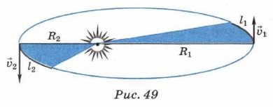 Глава 3. Следствия классической механики Небесная механикаЗаконы Кеплера3. Рассмотренные примеры движения спутника иллюстрируют, как классическая механика даёт объяснение первого закона Кеплера. Планеты Солнечной системы, являясь своеобразными спутниками Солнца, движутся вокруг него по эллиптическим орбитам. Поскольку форма орбиты определяется скоростью движения планеты, то очевидно, что скорость каждой планеты меньше, чем значение параболической скорости, соответствующей массе Солнца и расстоянию от него до данной планеты. В противном случае планеты не удерживались бы Солнцем на орбитах. В то же время скорость каждой планеты больше, чем значение соответствующей круговой скорости. Теория Ньютона позволяет не только дать объяснение первого закона Кеплера, но и обобщить его. Любое тело под действием силы тяготения движется по одной из трёх кривых — эллипсу, параболе или гиперболе. При движении тела по эллипсу в одном из его фокусов находится другое тело, со стороны которого и действует сила тяготения. Первый закон Кеплера, сформулированный таким образом, позволяет описывать не только движение планет, но и других тел, движущихся под действием сил тяготения. Опуская математические расчёты, проиллюстрируем объяснение второго закона Кеплера. Если бы планеты двигались по круговым траекториям, то их линейные скорости определялись бы формулой (3). Поскольку орбита планеты — эллипс и Солнце находится в одном из его фокусов, то расстояние от Солнца до планеты постоянно изменяется. Но, как вам известно, любое криволинейное движение, в том числе и движение по эллипсу, можно с достаточной точностью представить как движение по окружностям разных радиусов. Таким образом, чем дальше планета от Солнца на своей орбите, тем меньше её линейная скорость (рис. 49). А это значит, что планета, находясь ближе к Солнцу, за некоторый промежуток времени проходит больший путь, чем путь, пройденный за такой же промежуток времени, когда планета находится дальше от Солнца. Это и определяет равенство площадей, описываемых радиусом планеты за равные промежутки времени.
