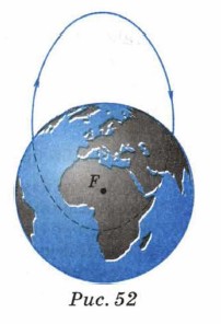 Решая баллистические задачи для межконтинентальных ракет, уже нельзя не учитывать шарообразность Земли. Траекторией движения такой ракеты, согласно первому закону Кеплера, является эллипс, один из фокусов которого находится в центре земного шара (рис. 52).