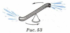 С реактивным движением вы достаточно часто сталкиваетесь в жизни. Так, например, действие обыкновенной «вертушки» для полива газонов основано на реактивном движении. Струи воды, вырываясь под давлением из трубок с загнутыми концами, заставляют вращаться эти трубки в противоположную сторону (рис. 53). Другой пример реактивного движения: наполненный воздухом и не завязанный надувной резиновый шарик, если его отпустить, будет совершать быстрые беспорядочные движения. Двигать его будет воздух, который под давлением резиновой оболочки вылетает из отверстия. Таким образом, реактивное движение возникает за счёт того, что от системы тел отделяется с некоторой скоростью часть этой системы.