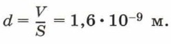 В этом опыте объём капли масла был равен V = 0,9 • 10-9 м3, площадь плёнки S = 0,55 м2. Толщина плёнки, т. е. диаметр молекулы
