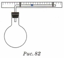 3. Как и все тела, газы при нагревании расширяются. Продемонстрируем это. Закроем колбу пробкой, в которую вставлена изогнутая под прямым углом стеклянная трубка (рис. 82). В горизонтальной части трубки поместим столбик подкрашенной воды. При нагревании колбы даже руками будет видно, как столбик воды смещается вправо, а при охлаждении — влево. В этом случае меняются температура и объём воздуха в колбе, а давление остаётся постоянным, равным атмосферному.