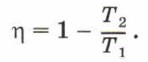 Глава 6. Свойства газов § 36. Принципы работы тепловых двигателей (окончание)Участок графика АВ соответствует изотермическому расширению рабочего тела. При этом оно получает от нагревателя, температура которого Т1, количество теплоты Q1. Участок графика ВС соответствует адиабатному расширению рабочего тела, при этом оно охлаждается до температуры Т2, равной температуре холодильника. Затем рабочее тело изотермически сжимается (участок графика CD) при температуре Т2. При этом холодильнику передаётся количество теплоты Q2. И наконец, рабочее тело адиабатно сжимается, его температура при этом повышается до температуры нагревателя Т1 (участок графика DA). КПД идеального теплового двигателя6. Поскольку тепловой двигатель Карно самый экономичный, он имеет и самый высокий коэффициент полезного действия при данной температуре нагревателя и холодильника. Он равен: