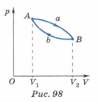 Существуют разные типы тепловых двигателей: паровая турбина, двигатель внутреннего сгорания, реактивный двигатель и др. Несмотря на различие конструкций двигателей и некоторые особенности их работы, принципы их действия одинаковы. Все тепловые двигатели, независимо от их особенностей, имеют три части: нагреватель, рабочее тело, холодильник. Рассмотрим их назначение. В тепловом двигателе происходит преобразование внутренней энергии в механическую энергию. Следовательно, необходимо иметь систему, за счёт внутренней энергии которой совершалась бы механическая работа. Такую систему называют рабочим телом двигателя. Механическая работа совершается при сжатии и расширении рабочего тела. Чем больше сжатие или расширение, тем большая работа совершается. Газы расширяются и сжимаются легче, чем жидкости и тем более твёрдые тела, поэтому в качестве рабочего тела чаще всего используют газ или пар. Так, в паровой турбине рабочим телом является пар, в двигателе внутреннего сгорания — газ, состоящий из смеси паров бензина и воздуха. Поскольку работа совершается за счёт внутренней энергии рабочего тела, то для увеличения внутренней энергии рабочее тело следует нагреть до некоторой температуры Т1. Поэтому в состав теплового двигателя входит нагреватель. В двигателе внутреннего сгорания нагревание рабочего тела происходит непосредственно в цилиндре при сгорании горючей смеси, которая впрыскивается в цилиндр. Нагреватель может быть и самостоятельным устройством, как в случае паровой турбины. Рабочее тело — пар нагревается в паровом котле, при этом энергия топлива превращается в энергию пара. Круговой процесс2. Рабочее тело, нагретое в нагревателе до температуры T1 расширяясь, совершает работу. Так, пар, попадая на лопасти турбины, расширяется и приводит турбину во вращение. Горючая смесь в двигателе внутреннего сгорания, достигая высокой температуры, оказывает большое давление на поршень, расширяется и совершает работу. На рисунке 98 приведён график зависимости давления газа от объёма. Площадь фигуры под графиком АаВ равна работе, которую совершает рабочее тело при расширении.