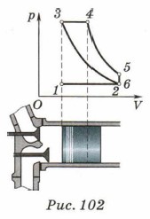 В конце такта сжатия в цилиндр впрыскивается топливо, которое при такой температуре самовоспламеняется и довольно медленно сгорает (на рис. 102 линия 3—4). Этот процесс можно считать изобарным. Затем следует адиабатное расширение (линия 4—5) и изохорное охлаждение (линия 5—6), после чего открывается выпускной клапан и продукты сгорания выбрасываются. Затем цикл повторяется.