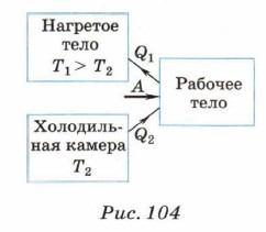 Глава 6. Свойства газов § 38. Работа холодильной машиныПринцип работы холодильной машины1. В тепловых двигателях работа совершается за счёт энергии, полученной от нагревателя. При этом количество теплоты, полученное от нагревателя, частично идёт на совершение работы, а частично передаётся холодильнику. Возникает вопрос, как осуществить обратный процесс, т. е. как передать энергию от менее нагретого тела более нагретому. Второй закон термодинамики запрещает такой процесс, если он единственный. Однако он возможен, если совершается за счёт работы внешних сил. Процесс передачи энергии от холодного тела к горячему происходит в холодильных машинах. Принципиальная схема холодильной установки изображена на рисунке 104. От холодильной камеры количество теплоты Q2 поступает к рабочему телу и при совершении внешними силами работы А нагретому телу передаётся количество теплоты Q1. Таким образом, Q1 = Q2 + А.