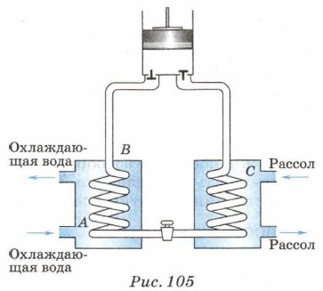 Компрессорная холодильная машина2. Рассмотрим работу компрессорной холодильной машины. В ней в качестве рабочего тела обычно используют пары жидкостей, кипящих при низких температурах: аммиак, фреон и т. п. Компрессор нагнетает пары аммиака под высоким давлением в змеевик А (рис. 105). При сжатии пары аммиака нагреваются и в сосуде В они охлаждаются водой. Вода при этом получает количество теплоты Q2, а пары аммиака превращаются в жидкость. Из змеевика А аммиак через вентиль поступает в змеевик С (испаритель). Часть аммиака здесь испаряется, и его температура понижается до 10 °С. Из испарителя аммиак отсасывается компрессором.