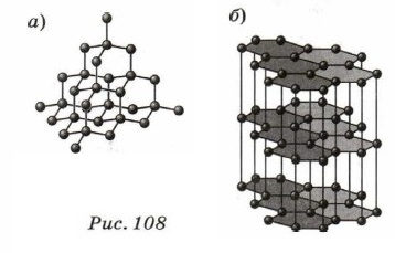 Глава 7. Свойства твёрдых тел и жидкостей Идеальный кристаллВ идеальном кристалле правильное расположение элементарных ячеек повторяется для сколь угодно удалённых атомов. Говорят, что в нём наблюдается >дальний порядок в расположении частиц. Частицами, из которых состоят кристаллы, могут быть атомы, молекулы, ионы. Соответственно существуют атомные, молекулярные, ионные и металлические кристаллы. Они различаются не только типом частиц, находящихся в узлах кристаллической решётки, но и природой и интенсивностью взаимодействия частиц. Полиморфизм2. Разные вещества имеют неодинаковые кристаллические решётки. Если кристаллические решётки образованы одним и тем же химическим элементом, получаются разные вещества с разными физическими свойствами. На рисунке 108, а представлена пространственная решётка кристалла алмаза, а на рисунке 108, б — графита, который также состоит из атомов углерода. Соответственно свойства вещества в состояниях с разной кристалличе- Рис.108 ской структурой различны. Так, алмаз значительно твёрже и прочнее графита. Способность вещества существовать в состояниях с разной кристаллической структурой называют полиморфизмом.