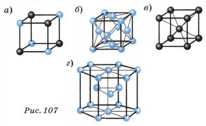 Правильная внешняя форма кристаллов объясняется их упорядоченной структурой, при которой атомы, молекулы или ионы, входящие в состав кристалла, занимают определённые положения в пространстве. Предположение о том, что правильная форма кристаллов связана с их внутренним строением, было сделано в середине XIX в. В 1912 г. немецкий физик Макс Феликс Теодор фон Лауэ (1879—1960) предложил исследовать строение кристаллов с помощью рентгеновских лучей. Этот и другие методы структурного анализа позволили в настоящее время изучить кристаллическую структуру более чем 30 000 веществ, от кристаллов химических элементов до сложнейших биологических кристаллов. Было установлено, что частицы, составляющие кристалл, расположены на некоторых расстояниях друг от друга в определённом порядке. Они связаны между собой силами взаимодействия, имеющими электромагнитную природу. Частицы, участвуя в тепловом движении, совершают колебания относительно некоторых положений равновесия. Совокупность точек, соответствующих положениям равновесия частиц, и воображаемых линий, соединяющих их, называют кристаллической решёткой. Кристаллическая решётка состоит из элементарных ячеек, которые представляют собой повторяющиеся элементы структуры. Так, элементарной ячейкой пространственной решётки кристалла поваренной соли является куб (рис. 107, а), а меди — гранецентрированный куб (рис. 107, б). Более сложную элементарную ячейку имеет кристалл натрия. Это тоже куб, но объёмно-центрированный (рис. 107, в). Кристалл магния имеет форму гексогональной (шестигранной) призмы (рис. 107, г). На рисунке 107 шарики обозначают точки равновесного положения атомов, а линии, соединяющие шарики, — силы взаимодействия между ними.