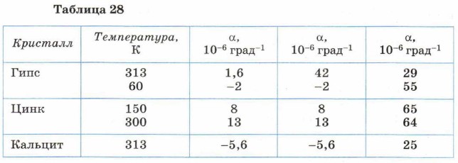 Как видно из таблицы, коэффициент линейного расширения монокристалла изменяется в зависимости от температуры и выбранного направления. У гипса и у кальцита они по некоторым направлениям принимают даже отрицательные значения. Это означает, что при повышении температуры монокристалл расширяется по одному направлению и сжимается по двум другим.