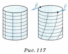 Глава 7. Свойства твёрдых тел и жидкостей § 41. Деформация твёрдого тела. Виды деформации (окончание)Пусть один конец стержня закреплён, а на другой действуют две параллельные и противоположно направленные силы, лежащие в плоскости, перпендикулярной оси вращения тела (рис. 117). При этом слои стержня повернутся друг относительно друга на некоторый угол. Возникающую деформацию называют кручением.